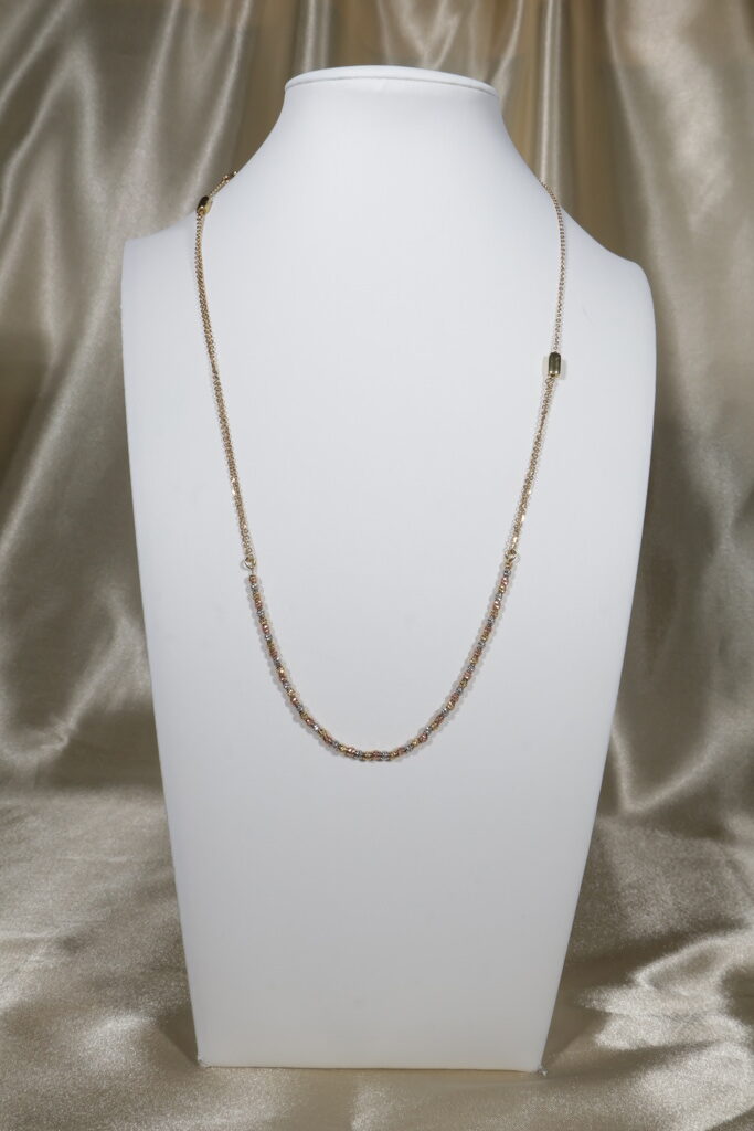 Elegant and versatile, the Aro Seguido Gradual chain features diamond-cut bead links crafted in three tones of 18K gold. With its adjustable length from 40 cm to 60 cm, this chain offers flexibility to style it in different ways, making it a timeless piece that blends sophistication, brilliance, and unique design.