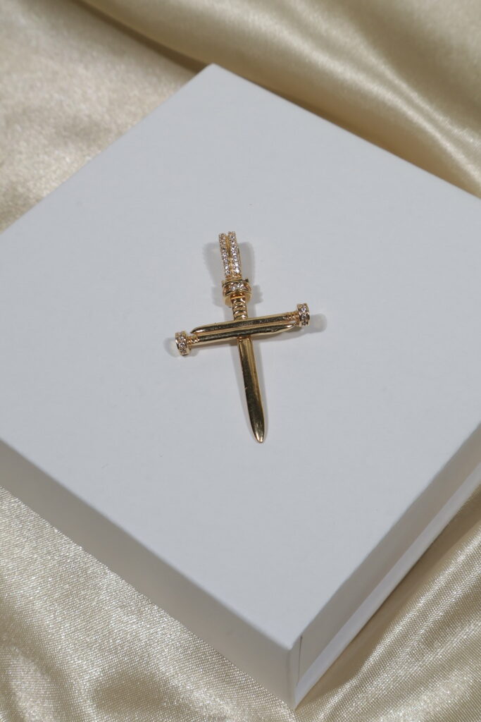 Bold and meaningful, the Nail Cross pendant is crafted in authentic 18K gold and adorned with brilliant white zirconia stones. Its striking design represents faith and resilience, blending spiritual symbolism with modern elegance.