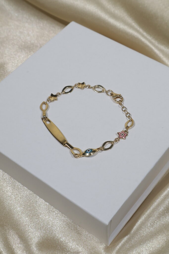 A delicate and meaningful piece designed especially for little ones. The Mystic Star Eyes baby bracelet features a polished ID plate with symbolic star-eye details, crafted in genuine 18K gold. Adjustable in length, it’s a thoughtful gift that combines protection, elegance, and lasting value.
